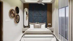 Elegant bedroom design featuring a luxurious bed with a tufted headboard, a multi-functional bedside table that doubles as a dressing table, and statement pendant lights against a beautifully textured accent wall.
