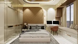Bedroom with wooden textured bed back wall with rounded corners and golden patti border, computer table with storage and drawer unit with orange chair