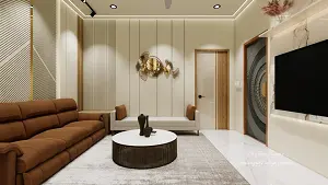 Living area with beige textured groove panel wall, gold mural art piece and door in a modern luxury interior