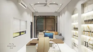 A sophisticated office interior designed for a perfume manufacturer — featuring a dramatic black niche for fragrance sample display, a premium boss cabin back wall and a sleek meeting table setup that blends commercial functionality with luxury aesthetics.