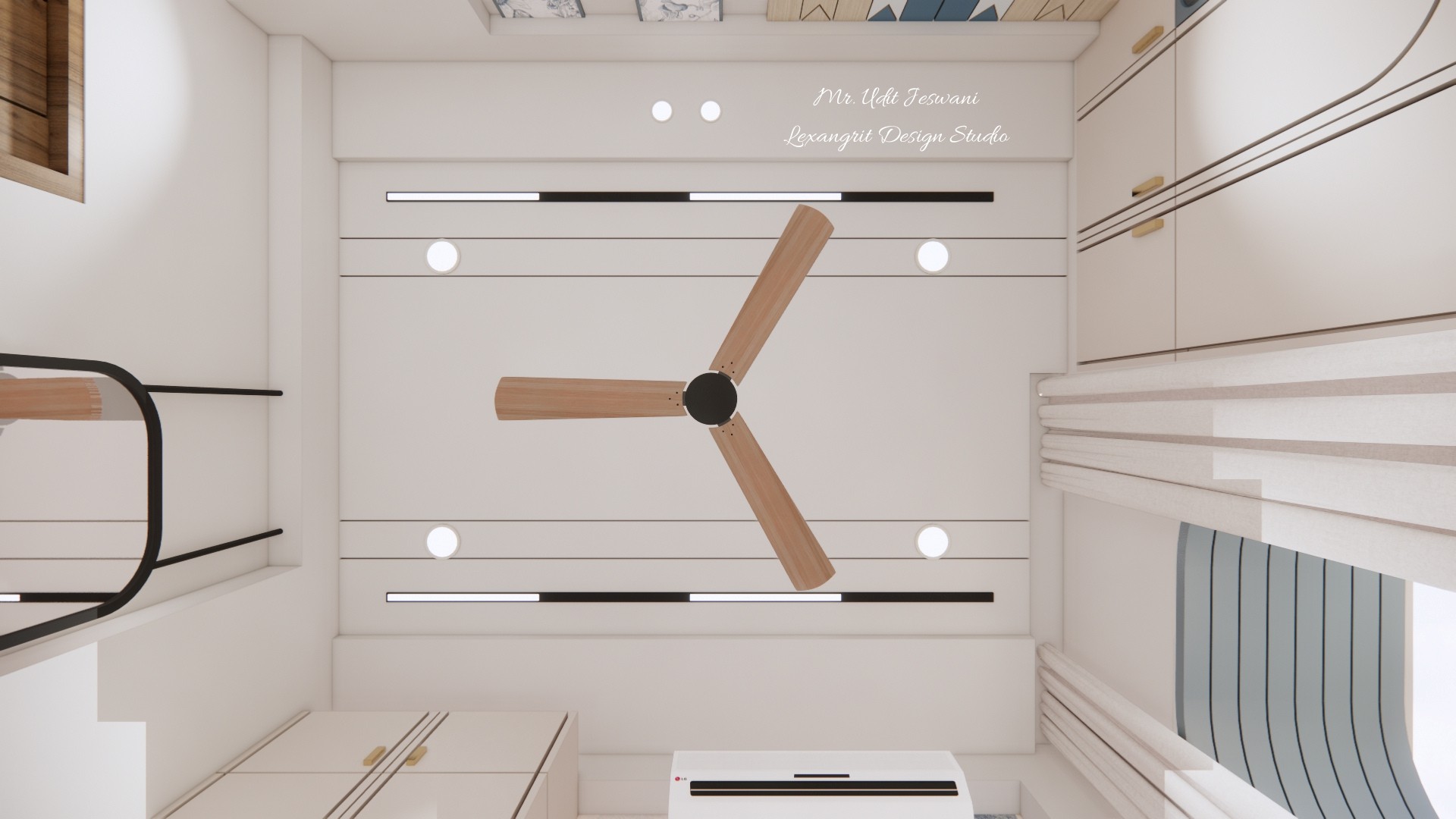 This ceiling design exemplifies sleek, uncluttered modernity. The strategically placed recessed lighting provides a warm, even glow that beautifully illuminates the entire room, avoiding harsh shadows. Complemented by a minimalist ceiling fan, it ensures both comfort and a clean aesthetic, contributing to an overall sense of refined spaciousness.