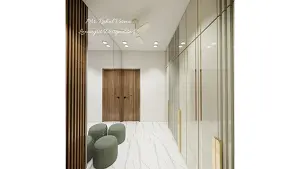Elegant dressing unit design showcasing louvers with mirror, UMT green laminate finish, luxury dressing unit with round lit mirror, and modern dressing unit design — a refined dressing table with louvers design and WPC mirror design for a stylish walk-in bedroom dressing area.