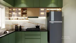 Cooking area view with open spice storage, fluted glass cabinet and loft storages
