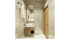 counter top wash basin ,WPC vanity cabinet with wooden finish laminate,a long mirror,on left wall towel hanger is given & on right wall we can see a door.