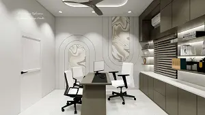 A modern small office interior featuring a plain wall with concealed wall almirah and entrance wall detailing, designed as a minimal, clean and budget-friendly office cabin solution.
