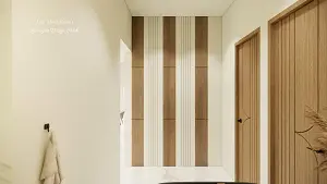 Handwash area view with white marble flooring, a focal wall of grooved vertical alternating wood and white panels, and light wooden doors with curved grooved patterns on the right.