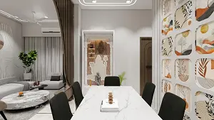 Dining area pooja unit crafted in HDHMR or plywood with UV marble finish laminate, featuring an illuminated Shiva sculpture at the center with minimal storage, a dining accent wall on the right, living area on the left, and a TV unit acting as a separator between the living and dining spaces.