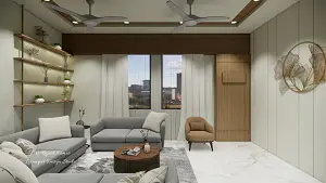 Drawing Room large sofa seating area front of center table and decorative wall ,some open shelf