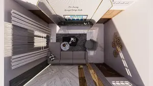 Elegant ceiling top view of a sophisticated lobby false ceiling design showcasing two fans, symmetrical layout, and modern aesthetic — a complete ceiling top view plan highlighting contemporary functionality and visual appeal for refined lobby interiors.