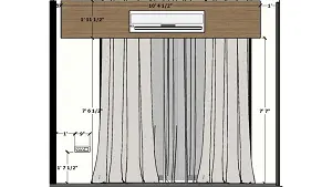 Drawing room view with wall art chandelier and full height curtain working drawing