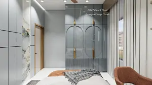 Elegant master bedroom featuring UV sheet design for bedroom front wall with horizontal and vertical groove cuttings, a semi-transparent onyx panel with profile lights, a full-size dressing unit to the left, and a bedroom UV sheet wardrobe with loft on the right, all unified in a refined grey aesthetic.