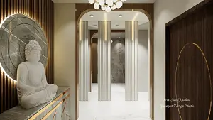Elegant entryway entrance foyer design featuring entryway Buddha statue interior design with Buddha entrance decor, decorative louvers, and chandelier lighting. This interior foyer blends Buddha temple for home concepts with Buddha entryway decor and Buddha statue decoration, creating a peaceful Buddha room design.