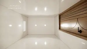A serene top view of the parents’ bedroom, featuring a neutral beige and white color palette, Italian white marble floors, a large bed with grey accents, and sleek built-in wardrobes with geometric detailing.
