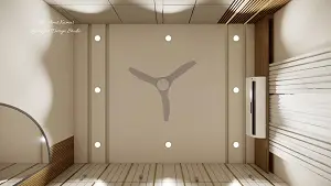 A view of the false ceiling made of gypsum, showing the layout of recessed lights, the ceiling fan, and an AC unit