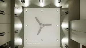 A top view of the ceiling, illustrating the symmetrical layout of the upper cabinetry, highlighting the placement of recessed spotlights and the central grey ceiling fan.