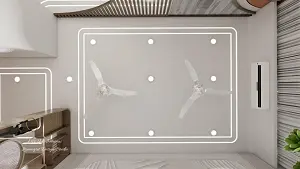 Modern false ceiling design using POP or gypsum board, highlighted with recessed lighting, two parallel rectangular profile light lines, and dual ceiling fans for balanced illumination and airflow.