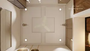 For ceiling we've used Gypsum boards with a fan at the centre and two hanging lights .