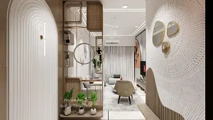 Foyer seperating living area with custom wooden separator