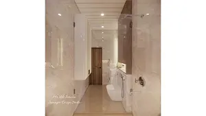 Glass partition seperates shower and wc area,storage at left.