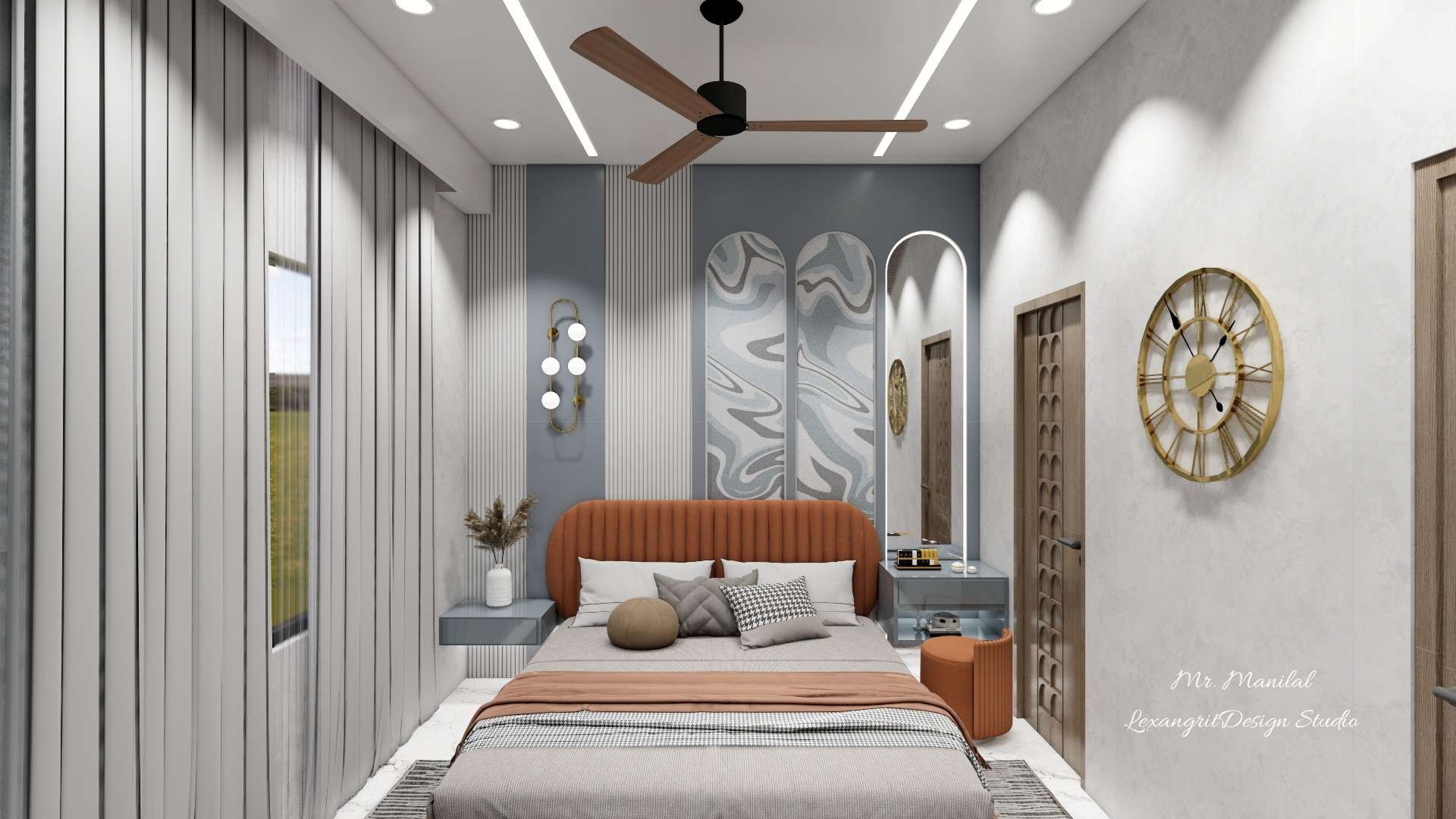 This bed back wall in a 10×12 bedroom features white louver panels, a subtle accent-colored strip with a pendant light, and dual arches filled with abstract wallpaper. An arched dressing unit with a hanging vanity drawer adds symmetry and functionality, creating a refined modern bedroom aesthetic. This featured image is a part We are interior designers in Mehsana | Mr. Bharat Bhai Manilal Patel's Villa interior design project by Lexangrit Design Studio