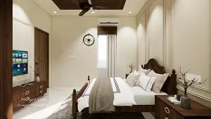 Guest bedrooom showing luxurious bed front of tv unit