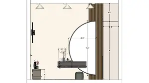 Detailed 2D dimension drawing of a modern dressing unit half moon mirror dressing table, illustrating the layout, console measurements, and positioning within a bedroom dressing room design.