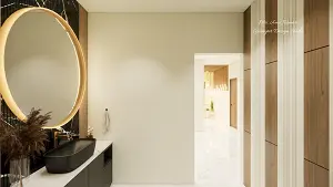 Handwash area with a black vessel sink and large gold-framed circular mirror, minimalist cream wall, wood-and-white striped accent wall on the right, and a doorway to a bright corridor with marble flooring.