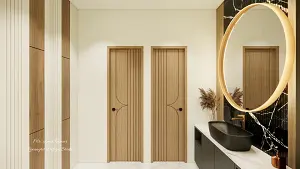 A view of the handwash area showcasing two wooden doors with grooves and a vanity area on the right with a black vessel sink and a large, glowing circular mirror against a black marble wall. while the left wall displays alternating vertical grooved panels of wood and white stripes.
