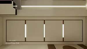 Here we can see the Ceiling of the lobby designed with a minimal grid kind of pattern with profile lights subjected to it with a dark groove finish .
