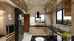 Here we can see the kitchen storage which include Two drawer unit,three drawer unit,magic corner,Rolling shutter, stove with chimney & hob, Pantry unit,fridge & open storage racks for daily usage,Black Quartz stone is given for the counter and beige Acrylic laminate finish is used for storage & concealed handles given for bottom sotage ,brass linear handles given for loft .