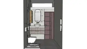 Image of the bathroom featuring a sleek vanity unit with a mirror and wall-mounted lighting against a tiled wall 2d dimensions