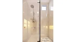 Image of the bathroom showcasing a spacious shower area with a glass partition and modern fixtures against a tiled wall