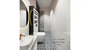 image of the bathroom showcasing a spacious shower area with a glass partition and modern fixtures against a tiled wall