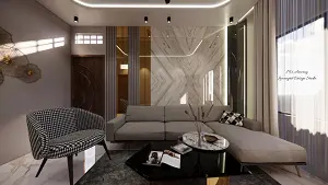 Image of the drawing room comfortable seating area with a large sofa, coffee table and decorative wall design