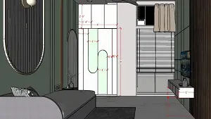 Image of the guest bedroom highlighting a built-in wardrobe and sleek tv unit with louvers wall 2d dimensions