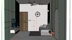 Image of the guest bedroom showcasing a sleek tv unit against a pastel-toned wall 2d dimensions