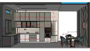 Image of the kitchen featuring modern cabinets, a sleek countertop, and built-in appliances against a tiled backsplash wall 2d dimensions