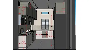 Image of the kitchen featuring modern cabinets, a sleek countertop, and built-in appliances against a tiled backsplash wall 2d dimensions