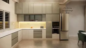 Image of the kitchen featuring modern cabinets, a sleek countertop, and built-in appliances against a tiled backsplash wall