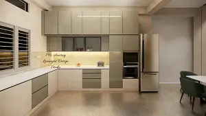Image of the kitchen featuring modern cabinets, a sleek countertop, and built-in appliances against a tiled backsplash wall