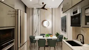 Image of the kitchen featuring modern cabinets, a sleek countertop, and built-in appliances against a tiled backsplash wall 2d dimensions
