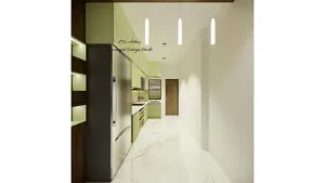 Plain gypsum false ceiling in a sage olive green modular kitchen — a budget-friendly solution to maintain ceiling height consistency, hide wiring and conceal the chimney exposed pipe.
