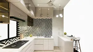 Image of the kitchen highlighting a stylish dining nook with a small table, chairs, and pendant lighting