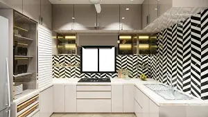Image of the kitchen showcasing a spacious pantry area with open shelving and storage units against a clean, bright wall