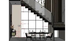 Image of the living room, dining room & stair case view 2d dimensions
