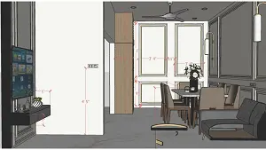 Image of the living room featuring a modern entertainment center with a flat-screen TV and built-in shelves against a sleek accent wall 2d dimensions