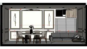 Image of the living room highlighting a spacious dining area with a contemporary dining table, chairs, and an elegant center table against a decorated wall 2d dimensions
