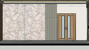 Image of the living room highlighting a spacious dining area with a contemporary dining table, chairs, and an elegant chandelier against a decorated wall 2d dimensions