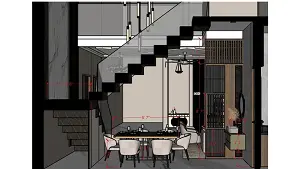 Image of the living room highlighting a spacious dining area with a contemporary dining table, chairs, and an elegant chandelier against a decorated wall 2d dimensions