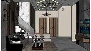 Image of the living room, dining room & stair case view 2d dimensions